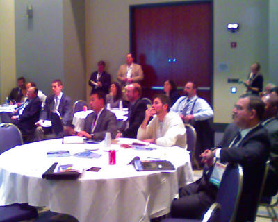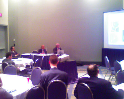 First photo shows the three speakers during Tom Plocek's presentation. Second photo shows part of the audience.