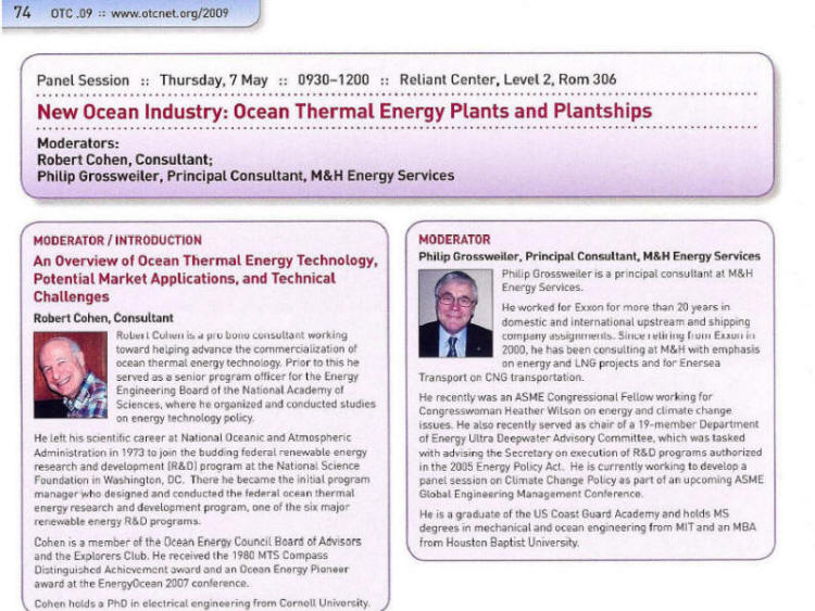 On May 7, 2009, OIA was an invited participant at a panel on OTEC at the Offshore Technology Conference (OTC) in Houston, TX. Founded in 1969, OTC is the world’s foremost event for the development of offshore resources in the fields of drilling, exploration, production, and environmental protection. OTC 2009 was attended by 67,721 energy professionals from more than 120 countries. A paper on why OTEC commercialization is possible now was presented by Thomas J. Plocek, OIA's Founder. Information on the presentations is shown below: