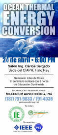 On April 24, 2008, OIA was invited to present on OTEC by the Caribbean chapter of the Institute for Electrical and Electronic Engineers (IEEE). The event, held at the College of Professional Engineers and Surveyors of Puerto Rico (CIAPR) was attended by a standing room only audience. José A. Martí, Manuel A. J. Laboy and Thomas Plocek provided attendees with basic information on OTEC and its potential for implementation in Puerto Rico. Click here for links to the presentations.